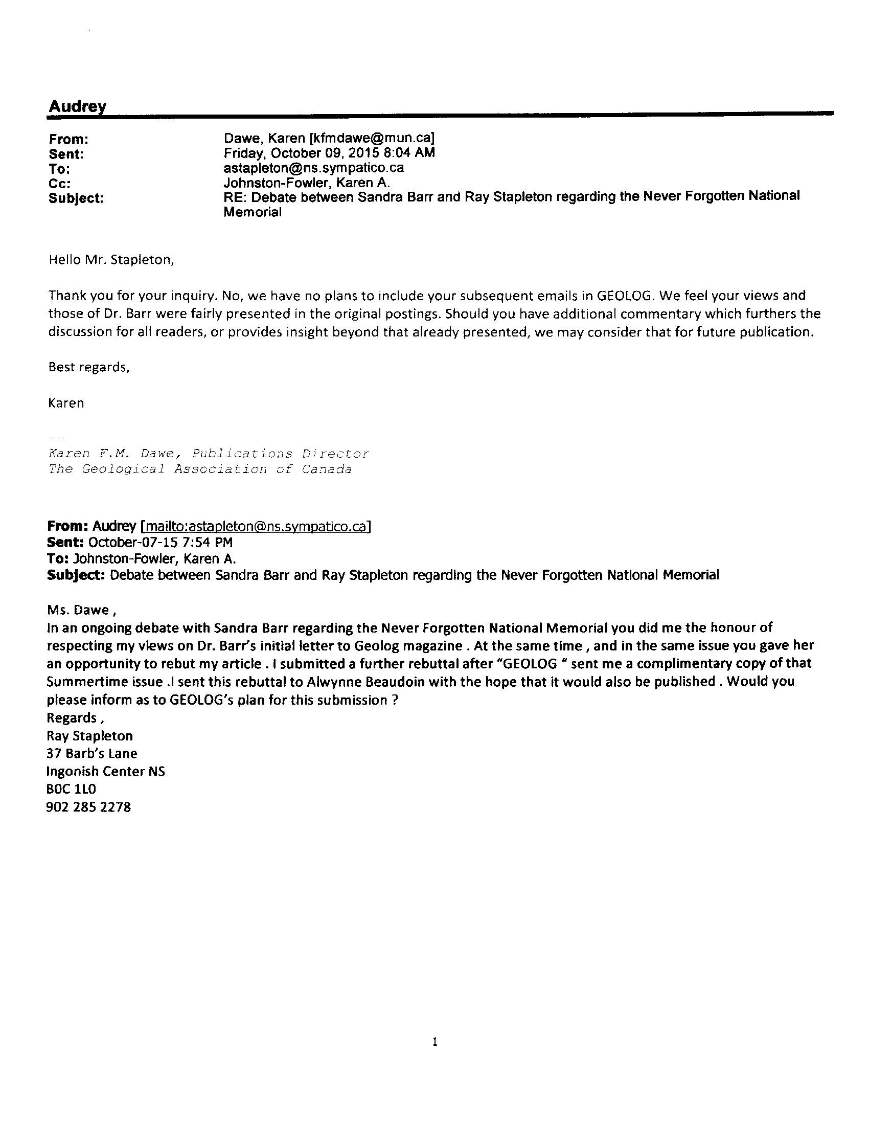 Acadia geologist, Dr. Sandra Barr, presented an appeal to Atlantic Canadian Geologists to speak against and reject the proposal for the Never Forgotten National Memorial (NFNM) at Green Cove. Ray Stapleton sought publication of a rebuttal which was granted-BUT- before publishing Ray’s article, GEOLOG sent it to Dr. Barr for a rebuttal. Ray then requested an opportunity to reply to Dr. Barr’s rebuttal; he sent his article which GEOLOG refused to publish.
